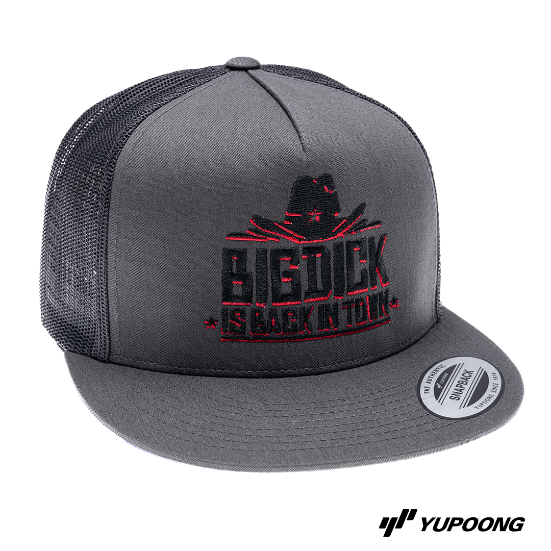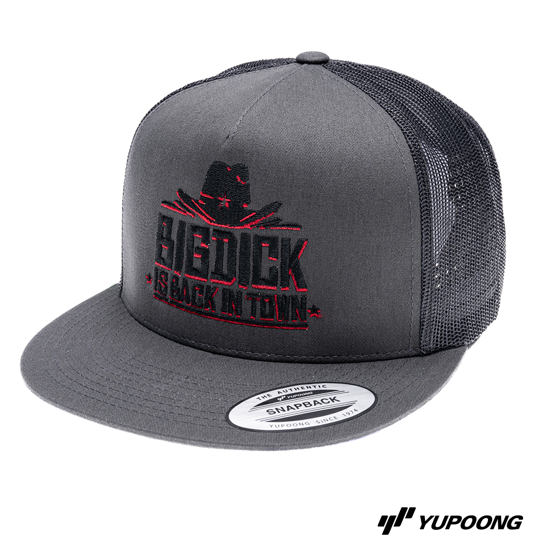 Den här kepsen tar ingen fånge. Grå trucker med eldig kombination av svart och röd brodyr – en cowboyhälsning som skriker “jag är tillbaka, deal with it”.